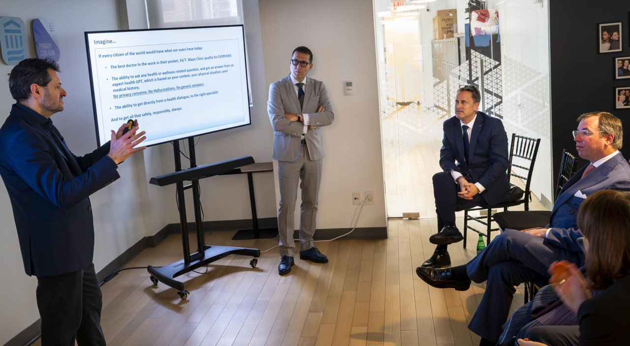 Pour son dernier jour à New York, S.A.R. le Grand-Duc, accompagné du Ministre Xavier Bettel, a visité l’entreprise healthtech « K Health », spécialisée dans le développement de solutions d’intelligence artificielle appliquées aux soins de santé.