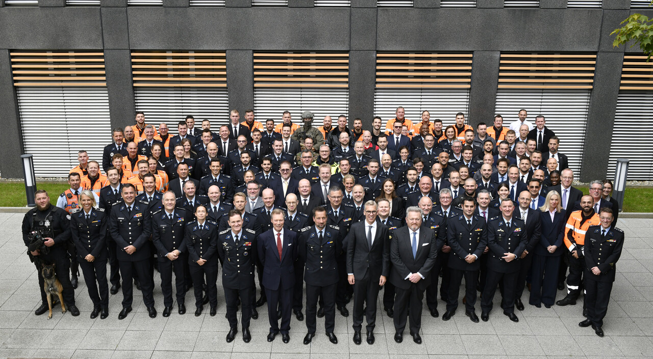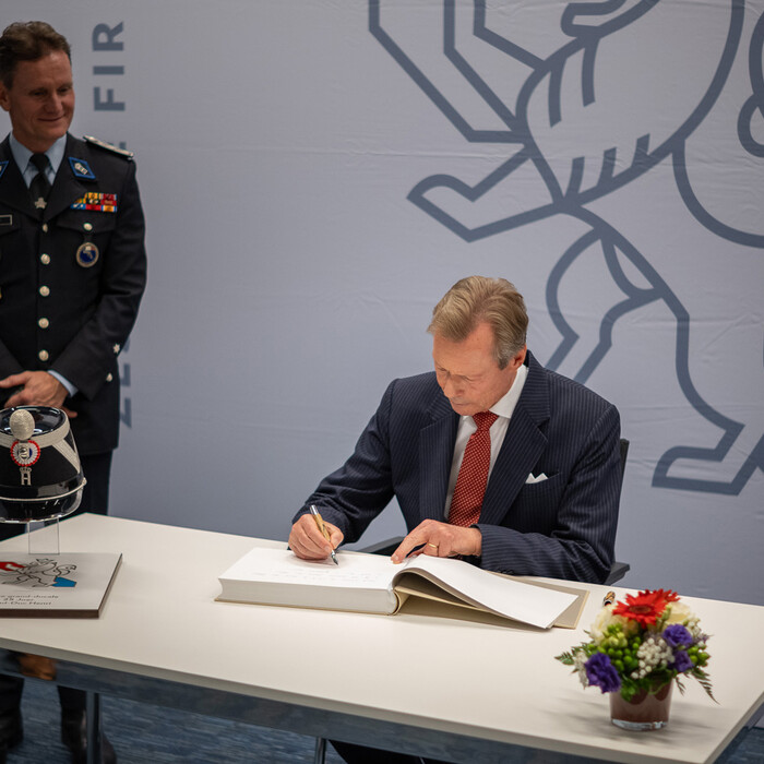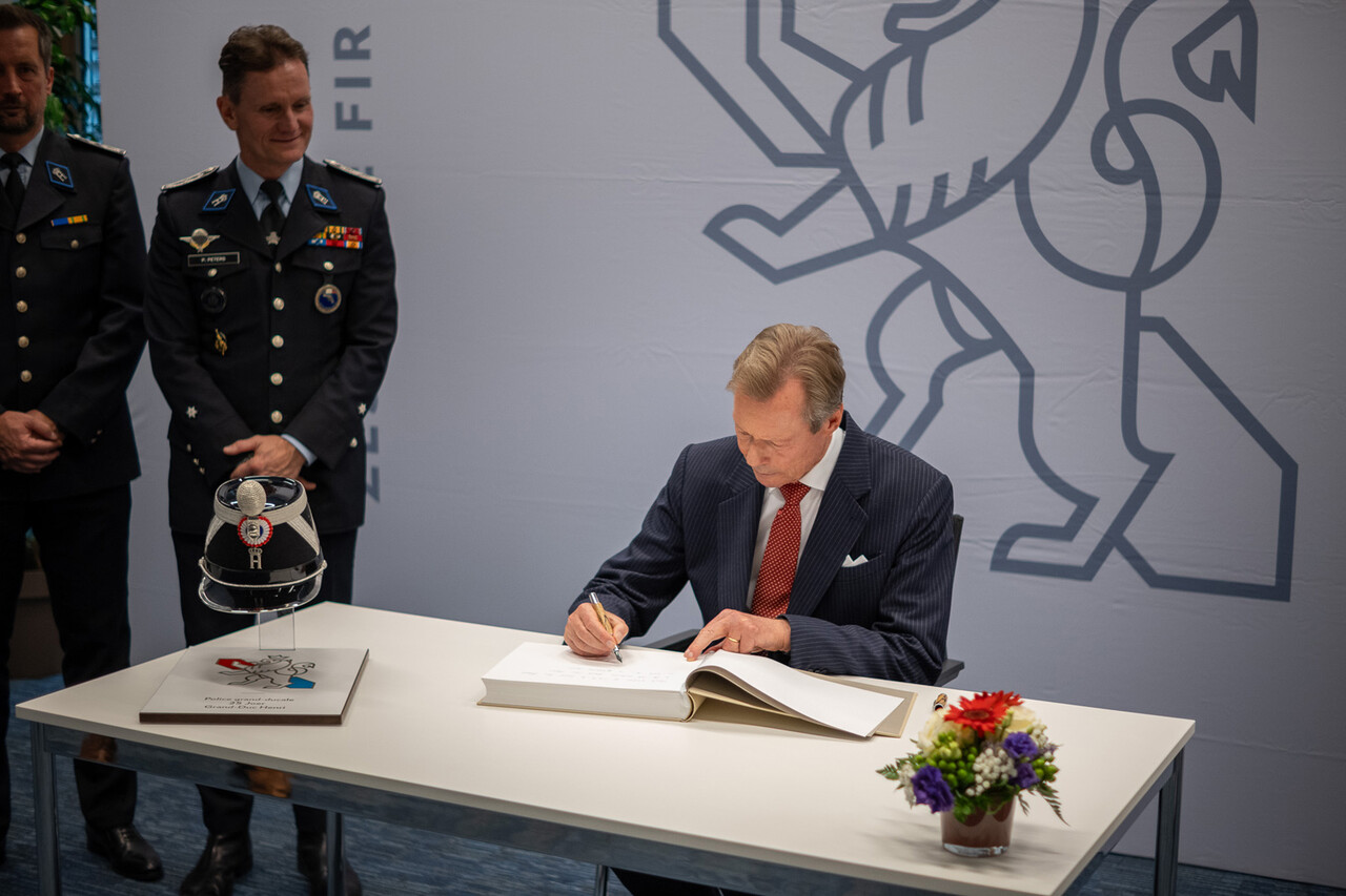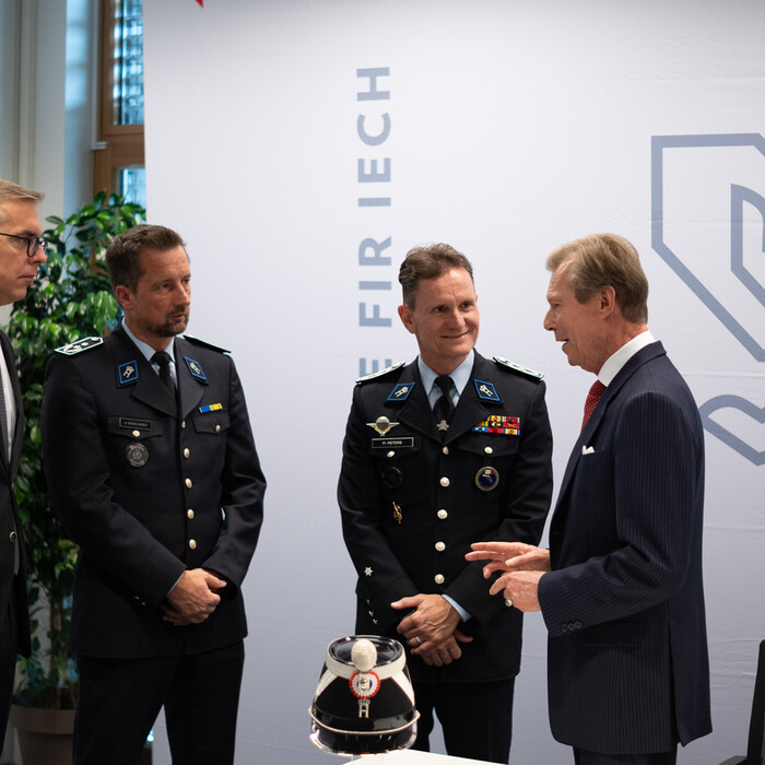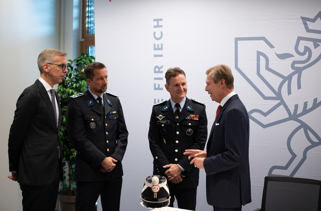 À trois jours du changement de règne, S.A.R. le Grand-Duc a effectué, ce mardi, sa visite d’adieu au siège de la Police grand-ducale au Findel, en présence du Ministre Léon Gloden et du Directeur général de la Police, Pascal Peters.